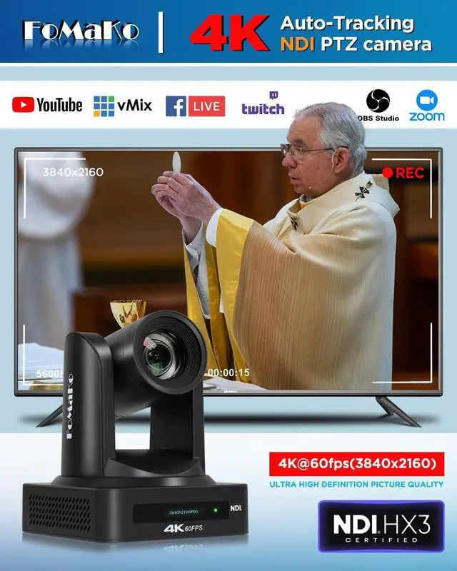 K800N: NDI License Included. ) ^^ FoMaKo NDI PTZ Camera. NDI 6 and NDI ^^ HX3 Support (NDI License Included, Officially Approved by Newtek Inc). Low latency. Support plug and play, which is convenient for project implementation and deployment. Compatible with Video Mixer Switcher and FoMaKo PTZ controller, Compatible with vMix/OBS and other Live Video Streaming Software, Multi-cameras video production for live streaming to YouTube and facebook. ^^ Advanced AI Auto-Tracking Gen 3 Version. FoMaKo third-generation AI Tracking enables more customized tracking features, such as you can adjust the tracking modes, tracking sensitivity, figure size, character position and lost target action. You can choose real-time tracking and regional tracking according to the use of the environment. simply press F2 on the remote control to turn on automatic tracking and Press F4 to switch tracking target. ^^ Leading Auto-Focus (AF) Technology. Fast, accurate and stable Auto-Focus (AF) technology. Pan/Tilt/Zoom Speed Adjustable, Preset Speed Adjustable as well. Support Focus Mode Auto/Manual/One Push Focus. Compared to our competitors, our Auto-focus speed is much faster, FoMaKo PTZ camera maintains clear HD image both during movement and zoom in/out zooming.