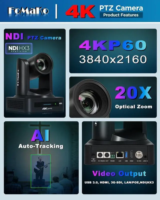 FoMaKo 4K 60FPS NDI PTZ Camera, Support NDI HX3 4K 60fps Video output. 20x Optical zoom. 3-Channels 4K video output, HDMI/LAN support 4K at 60fps, USB Support 4KP30, and 3G-SDI /NDI support 1080P at 60fps. Uncompressed Ultra High Definition Video, PoE supported. Made for Church Worship Live Services Live studio, Events. (