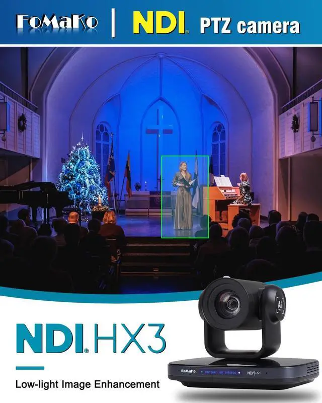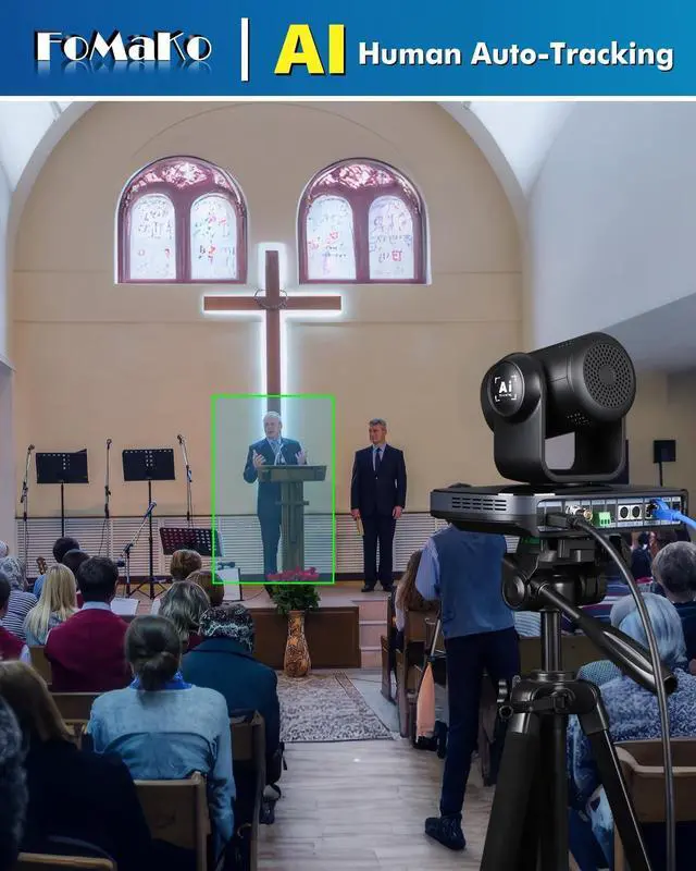 FoMaKo NDI PTZ Camera HD 1080P 30x optical zoom. HDMI/NDI/LAN/3G-SDI/USB PTZ Camera. Using 1/ 2.8 -inch high-quality HD CMOS sensor with effective 2.07 million pixels. Supports HDMI 2.0 interface and Output HDMI 1080P at 60fps Uncompressed Ultra High Definition Video, Made for Church Services, house of Worship, Teaching and Education, Broadcast, High-Tech Conference, Summit Forum, Events. PoE supported. ^^ Advanced AI Auto-Tracking Gen 3 Version. FoMaKo third-generation AI Tracking enables more customized tracking features, such as you can adjust the tracking modes, tracking sensitivity, figure size, AI-Track Speed, Horizontal tracking only, character position, lost target action, etc.