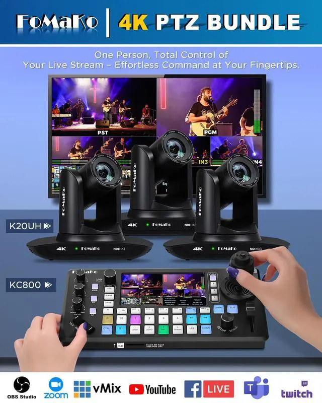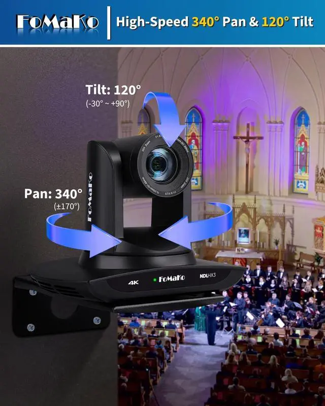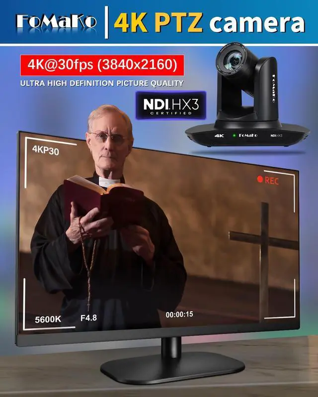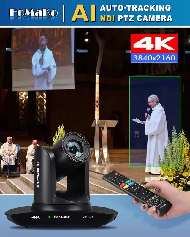 UHD HD Video Resolution: Resolution is up to 3840x2160 with frame rateup to 30fps. 1/ 2.8 inch high quality CMOS sensor, 8.42MP Effective Pixels. Made for Church Live Services, house of Worship, Teaching and Education, Broadcast, High-Tech Conference, Summit Forum, Events. PoE supported. ^^ Advanced AI Auto-Tracking Gen 3 Version. FoMaKo third-generation AI Tracking enables more customized tracking features, such as you can adjust the tracking modes, tracking sensitivity, figure size, character position and lost target action. You can choose real-time tracking and regional tracking according to the use of the environment. simply press F2 on the remote control to turn on automatic tracking and Press F4 to switch tracking target. ^^ Official NDI Camera, NDI 6 & NDI HX3 Certified. FoMaKo NDI PTZ Camera is the real OFFICIAL NDI brand by Newtek (NDI Video), which you can verify from NDI Video website, Official NDI means More stable, better video quality through NDI flow, even under low bandwidth network (NDI HX3 Supported).