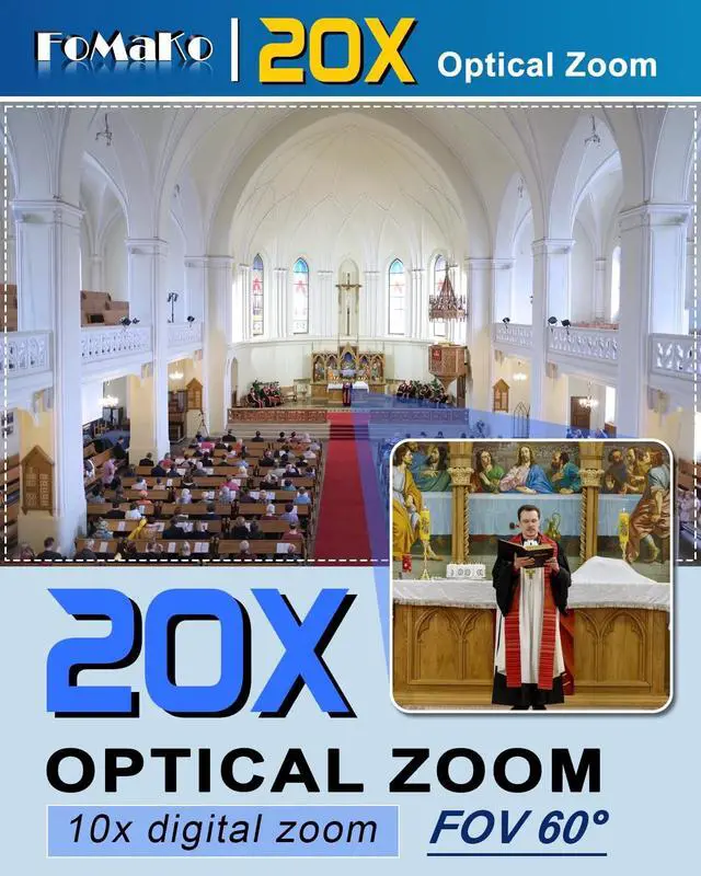 FoMaKo NDI Camera. AI Auto Tracking PTZ Camera, HDMI PTZ Camera, support Full 1080P all video output up to 60fps, ture to life colors, a budget HDMI PTZ Camera and made for Church live service, School, Live Streaming, Broadcast, Hospital, Wedding, and house of worship. PoE supported.