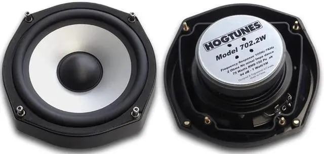 Includes 2 ohm 7" woofers, grilles (not shown) and all required hardware. Includes wire harness to plug into the rear channels of 450-AA. Requires amplifier (not included). Requires FLHT-style vented fairing lowers.