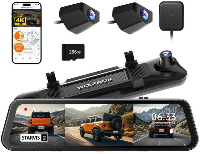 Its waterproof construction ensures durability in all weather conditions, making it perfect for rugged terrains. With its pioneering angle, it offers unprecedented terrain monitoring to meet the demands of off-road enthusiasts ^^ [4K 3 Channel Camera] The WOLFBOX rearview mirror camera offers extensive coverage by recording in 4K front, 2.5K rear, and 1080P from the bumper. The rear camera, featuring a 1/ 1.88 -inch sensor with a 2.9 m pixel size, offers exceptional light sensitivity. It captures video at 2.5K 2560*1440 resolution at 30FPS. Additionally, Purecel Plus Technology significantly enhances night vision, establishing a new benchmark for clarity in low-light conditions ^^ [Effortless 5.8GH z WiFi & Voice Control] Equipped with 5.8GH z WiFi, the dash cam mirror ensures quicker and more reliable connectivity to your smartphone.