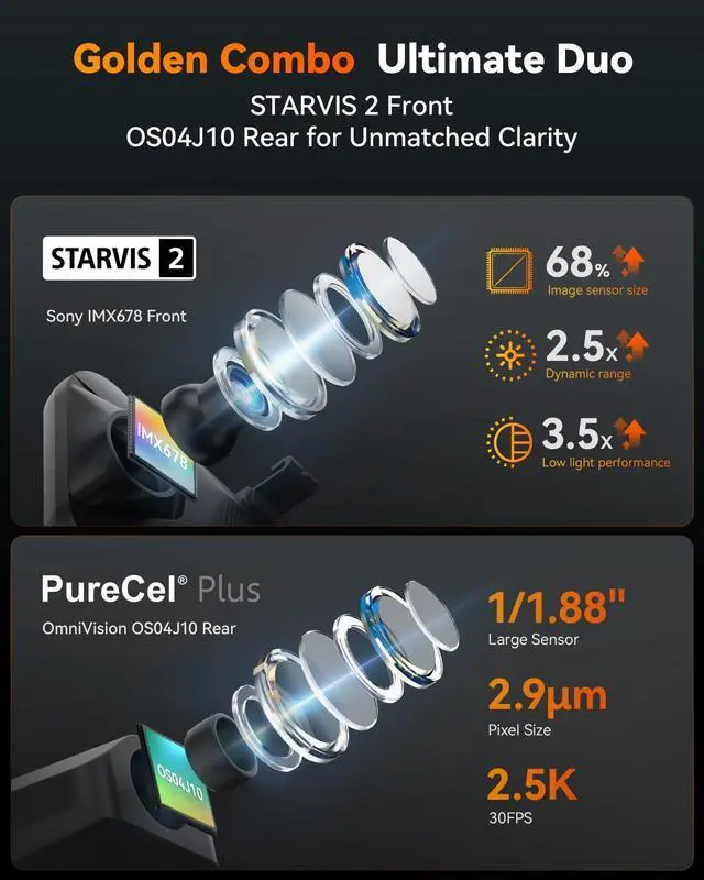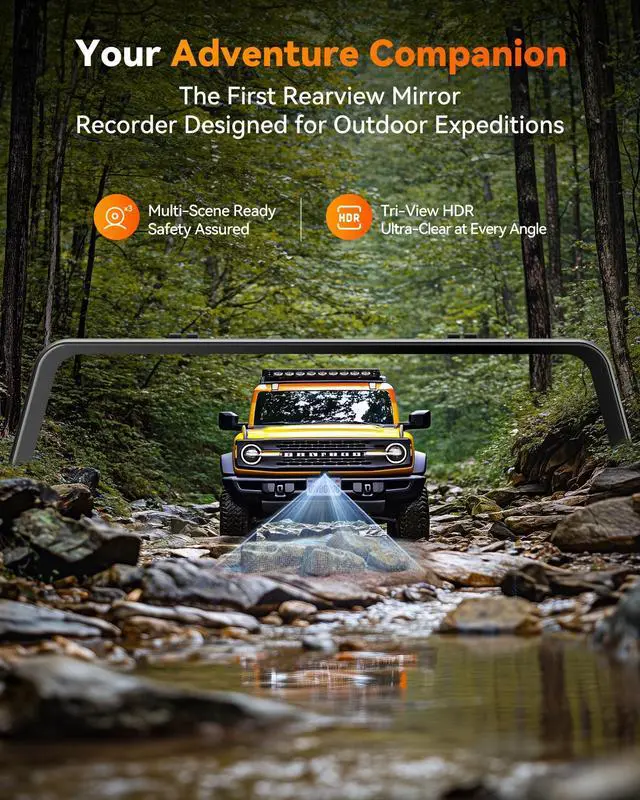 [STARVIS 2 4K Mirror Dashcam] The WOLFBOX G900 Tripro's front camera, featuring the advanced STARVIS 2 IMX678, captures stunning 4K 3840*2160 resolution video at 30FPS. Thanks to the larger photosensitive area of STARVIS 2, it excels in low-light conditions and offers an improved dynamic range. This technology ensures that your footage is clearer and more vibrant, with enhanced contrast and detail, even in challenging lighting environments ^^ [Outdoor Adventure Dash cam] Introducing the groundbreaking bumper-mounted dashcam, designed for outdoor explorers. This innovative WOLFBOX rear view mirror camera captures video from a unique front bumper perspective.