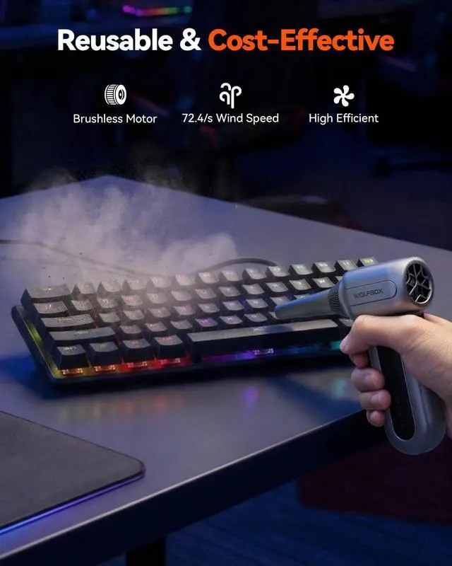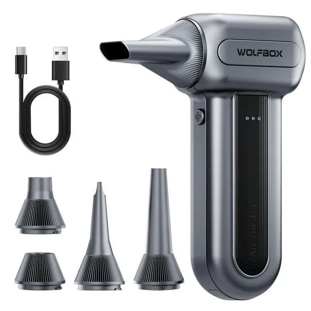 110, 000 RPM HIGH-SPEED CLEANING POWERDriven by a high-efficiency motor reaching up to 110, 000 RPM at the highest setting, this electric air duster delivers concentrated airflow to remove dust, crumbs, and fine particles from keyboards, PC cases, radiator fans, and other hard-to-reach areas without physical contact. ^^ 3 SPEED CONTROL FOR PRECISE TASKSThree selectable speed levels adapt to different cleaning needs: 25, 000 RPM for delicate electronics, 60, 000 RPM for routine dust removal, and 110, 000 RPM for stubborn debris. One tool covers light maintenance to deep cleaning across multiple devices and surfaces. ^^ EXTENDED RUNTIME RECHARGEABLE DESIGNBuilt with a high-capacity rechargeable battery, the MF70 supports extended use across multiple cleaning sessions on a single charge. At the 1st gear, it blows for up to 300 minutes on a full charge. Cordless operation allows unrestricted movement around desks, vehicles, and workspaces without the limits of power cables. ^^ LIGHTWEIGHT AND PORTABLE FORM FACTORWeighing approximately 0.5 lb, this compact air blower is easy to hold and control during use. Its portable size fits easily into backpacks, toolkits, or car storage, making it suitable for home, office, travel, and on-site equipment maintenance. ^^ REUSABLE ALTERNATIVE WITH 5 NOZZLESDesigned as a reusable alternative to disposable compressed air cans, this air duster includes 5 interchangeable nozzles for keyboards, computer interiors, car vents, camera equipment, and general cleaning tasks, supporting long-term, cost-conscious use.