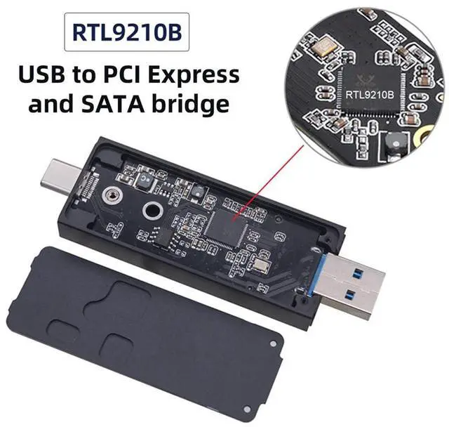 The RTL9210B chipset is a USB bridge that combines a USB device with both a PCIe controller and a SATA controller. Via the PEDET interface of M. 2 mechanical, it can auto switch USB-to-PCIe mode, or USB-to-SATA mode.
