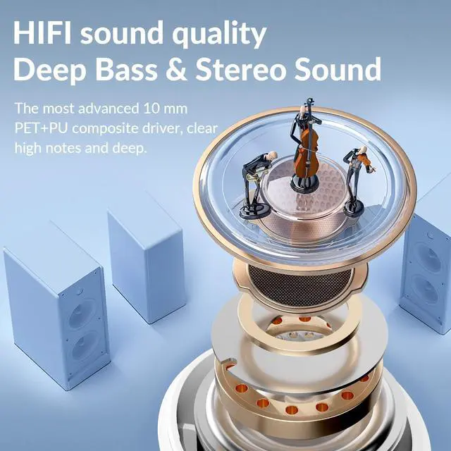 HIFI sound quality & Bluetooth 5.3Enjoy HIFI sound quality with advanced Bluetooth 5.3 and 10mm PET+PU composite driver. Wireless headphones support SBC/AAC codec, improving communication speed, range, and stability. Well-balanced sound from deep bass to smooth mid-highs, delivering sound closer to the original. Game mode support 38ms low latency, improving the video viewing and game experience.