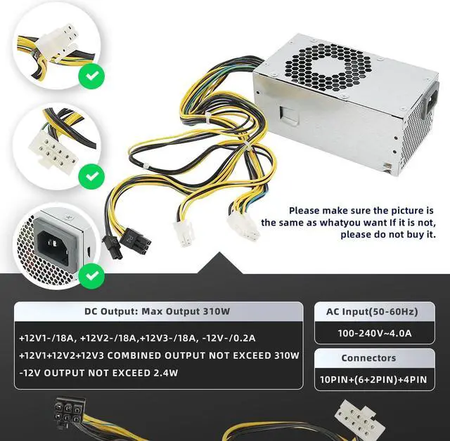 - Specification: AC Input(50-60Hz): 100-240V~4.0A. DC Output: Max Output 310W.+12V1-/18A, +12V2-/18A, +12V3-/18A, -12V-/0.2A; +12V1+12V2+12V3 combined output not exceed 310W, -12V output not exceed 2.4W. Connectors:10PIN+(6+2PIN)+4PIN.