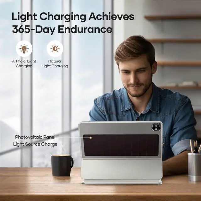 Light Charging: With a photovoltaic panel, keyboard case is automatically charged via light (natural light or artificial light), possessing an extremely long 365-day endurance, eliminating the troubles of forgetting to charge or no cable to charge