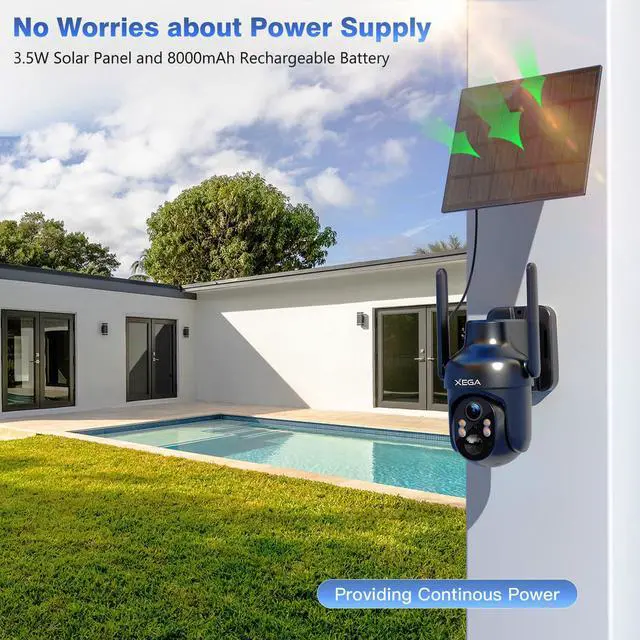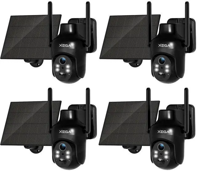 Xega 4 Pack Security Camera Wireless Outdoor, 2K PTZ Camera WiFi Surveillance Rechargeable Battery with Solar Panel, Color Night Vision, 2-Way Audio, PIR Motion Detection, Spotlight & Siren, IP66