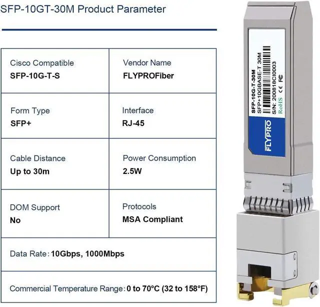 Wide-Compatibility - The 10GBase-T SFP+ to RJ45 Transceiver fully compatible with Cisco SFP-10G-T-S/Meraki MA-SFP-10G-T, Netgear, Ubiquiti, Supermicro, Linksys, QNAP, Unifi, Broadcom, D-Link, TP-Link and other open switches, and used in fiber switches, routers, NIC, media converters, servers and other fiber equipment with 10Gb SFP+ transceiver ports.