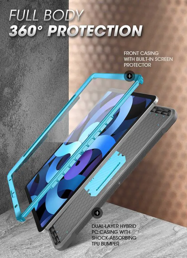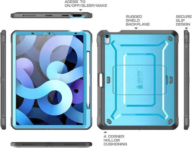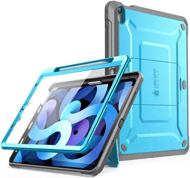 SUPCASE unicorn beetle pro series rugged kickstand protector case is made of unbending polycarbonate and shock-absorbing TPU material. Full-body case with built-in screen protector. Pencil holder with easy popout access and built-in kickstand for hands-free convenience. Compatible with iPad Air 4 (2020) and Air 5 (2022).
