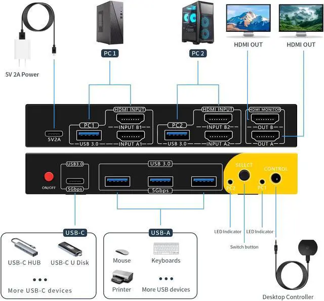 KVM Switch 2 monitors 2 computers 8K@60HZ USB3.0 HDMI KVM Dual Monitor Switch allows you 2 computers 2 monitors 1 set of USB keyboard and mouse shared switching. Includes 3 USB-A ports and 1 USB-C port, with the USB-C port can be compatible with more USB devices. The output has 2 HDMI ports for connecting 2 monitors. You can use two modes, Duplicate Mode: both monitors display the same screen and Extended Mode: both monitors display different screens. Note: Your computer needs to have 2 HDMI output ports to support dual screen display.