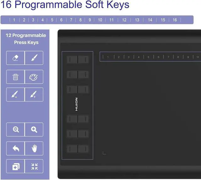 Press Keys:12 programmable press keys plus 16 programmable soft keys, you can set shortcut keys on drawing tablet's driver based on your preferences, such as erase, zoom in/out, scroll up and down, and so on.