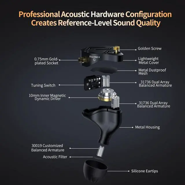 Profession Acoustic Hardware Configuration earbuds gaming iems KZ ZS12 PRO X in-ear monitors wired headphones for singers adopts a combination of 10mm super-liner inner magnetic dynamic drive&31736 dual array balanced armature*2&30019 customized balanced armature.Upgraded kz zs10 pro x ear monitor system headphones. kz zs12 pro x in ear headphones iem earbuds bringing a sound quality experience far beyond HIFI level,meeting the needs of professional musicians,audiophiles with high requirements f