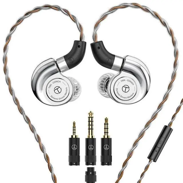 TRN Conch Wired Earphones with Mic 10mm Dual Driver HiFi in-Ear Monitors ^^ Detachable Cable & 3 Interchangeable Nozzles, Includes 2.5 mm/ 3.5 mm/ 4.4 mm Jack (Silver)