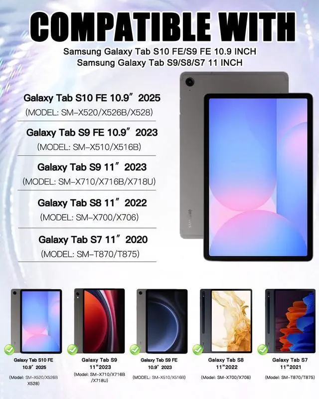 Compatibility: The Rugged case is compatible with Samsung Tab S10 FE 2025 Model: SM-X520/X526B/X528U, Samsung Galaxy Tab S9 FE 10.9 Inch 2023 Model: SM-X510/X516B, Samsung Galaxy Tab S9 11 Inch 2023 Model: SM-X710/X716B/X718U, Samsung Galaxy Tab S8 11 Inch 2022 Model: SM-X700/X706, Samsung Galaxy Tab S7 11 Inch 2020 Release Model: SM-T870/T875/T878U. Not fit any other tablet. Before purchasing, please confirm the model of your Samsung tablet