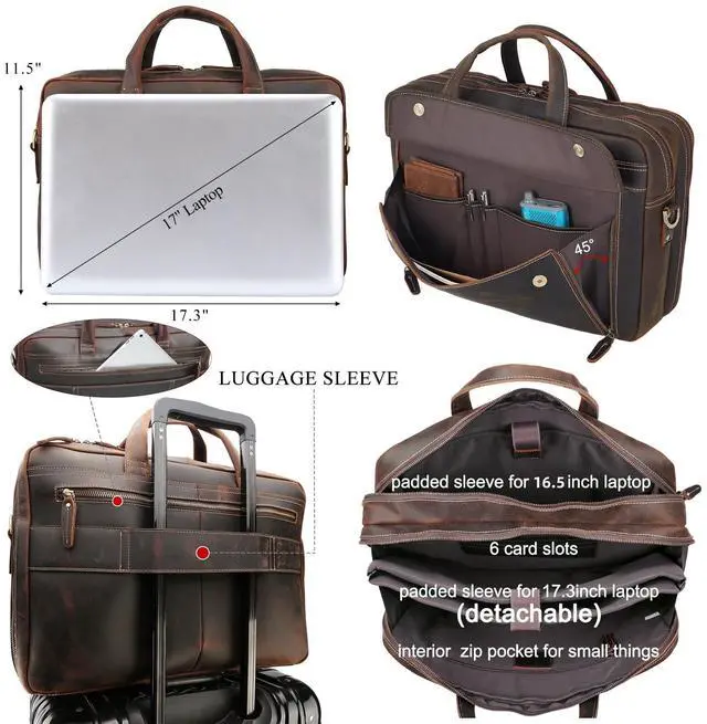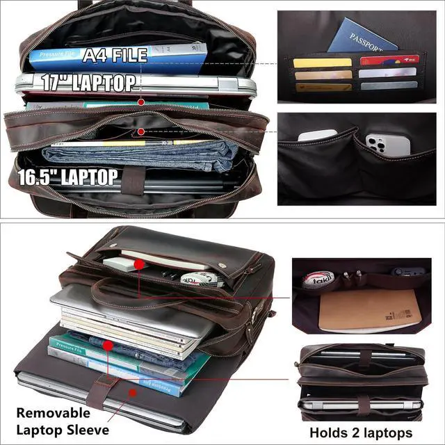 Special FeatureThe leather laptop briefcase can hold 2 computers at the same time. 1 removable sleeve for 17.3" laptop and 1 fasten sleeve for 16.5" to 17 laptop. The laptop bag has been updated to ykk metal zippers, which can bear 1000 times pull strength testing, to ensure quality and reliability. Shoulder straps hooks are upgraded to ensure durability.