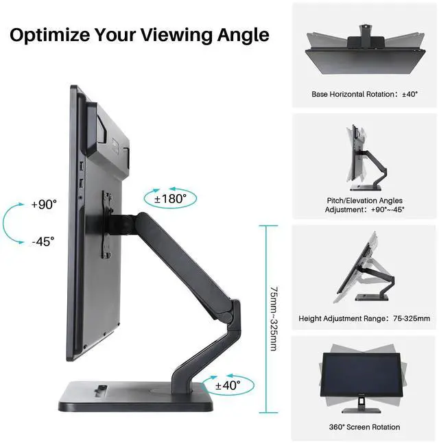 Optimize Your ViewThe joint between the Arm and the base is rotatable ±40°, while the arm is also able to be adjusted up and down from 75-325mm in height. The VESA connector can be flipped up and down 135° vertically and rotated 360° horizontally. This computer monitor stand can remain completely stable at any angle without any extra work.