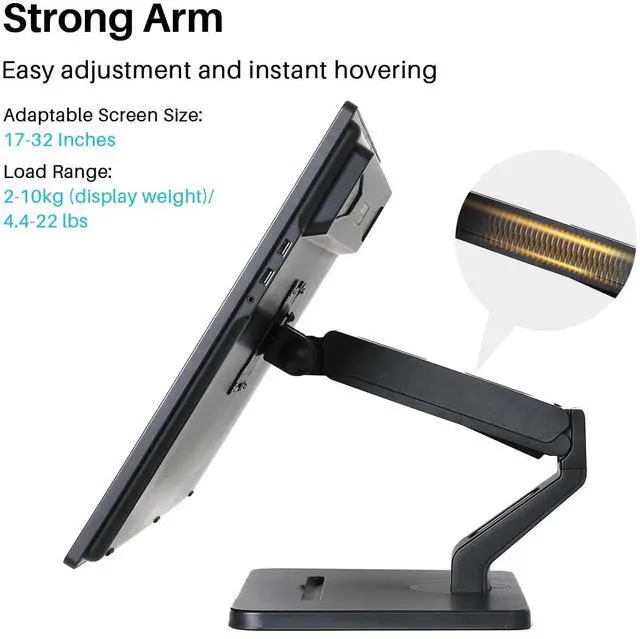 Fits 17" To 32" ScreensSingle monitor arm fitting most screens 17" to 32" in size and 4.4 lbs to 22 lbs in weight with VESA 75x75mm or 100x100mm backside mounting holes. Give your monitor or touchscreen a flexible, sturdy setup that lasts.