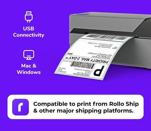 ROLLO PRINTER: Rollo USB is compatible with both Windows (XP and newer) and Mac (10.9 and newer) with easy set up; Print shipping labels, warehouse labels, FBA labels, barcodes, and more; Connect your laptop or Macbook via USB and download Rollo drivers