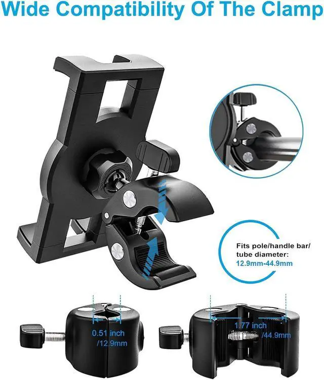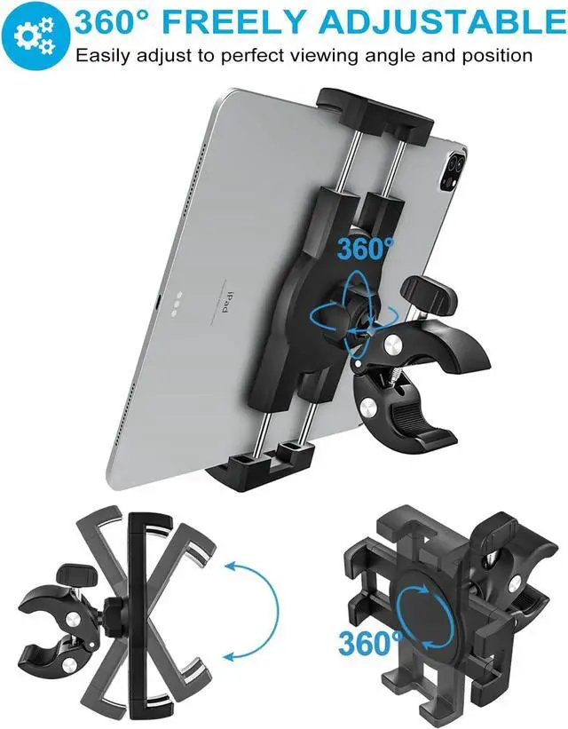 Universal Compatibility woleyi indoor peloton bike tablet holder, the adjustable side clamps extend from 4.7 in to 10.2 in, compatible with all 4 - 13 inch smartphones and tablets, such as new 2024 iPad Pro 13-in./ 12.9/ 11/ 10.5/ 9.7, iPad Air 6/ 5/ 4, iPad Mini 6/ 5, iPad 10th Generation; Galaxy Tab S, Galaxy Tab A; Fire HD; Surface Pro, Surface Go; Nexus Tablets; Android Tablet PC series; iPhone 16 Pro Max, 15, 14, 13, 12, 11, Xs; Galaxy Z Fold 6/ 5/ 4/ 3/ 2, Galaxy S24 / S23; e-Readers etc more tablets and smartphones with or without a case or sleeve.