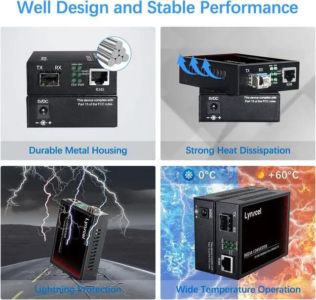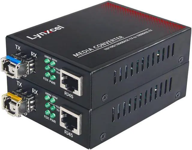 Lynxcel Gigabit Fiber to Ethernet Media Converter, Single Mode Fiber Media Converter with 2Pack Bidi SFP SMF LC Module, 10/100/1000Base-TX to 1000Base-FX SFP to RJ45 Converter, up to 20km