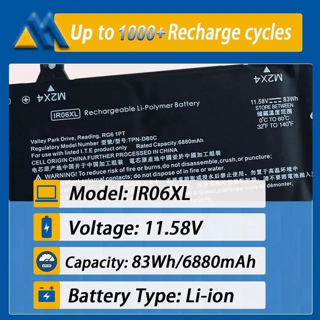 Tech Specs & 100% New Products Model: IR06XL Voltage:11.58V Capacity: 83Wh/6880mAh Battery type: Li-ion. (We only use grade A battery cells that provide up to 500 recharge cycles over the life of the battery. Come with screwdrivers.)