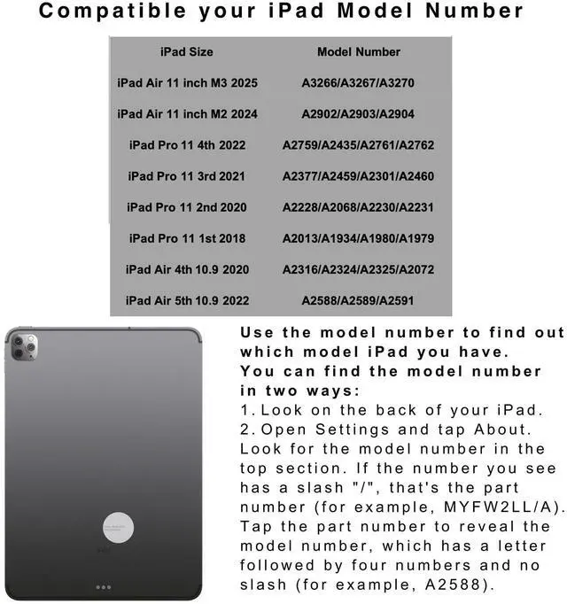 Fit for ipad Air 11 inch M3 2025 (A3266/A3267/A3270) M2 2024 (A2902/A2903/A2904), iPad Pro 11 4th 2022 (A2759/A2435/A2761/A2762),iPad Pro 11 3rd 2021 (A2377/A2459/A2301/A2460),iPad Pro 11 2nd 2020 (A2228/A2068/A2230/A2231),iPad Pro 11 1st 2018 (A2013/A1934/A1980/A1979),iPad Air 4th 10.9 2020 (A2316/A2324/A2325/A2072),iPad Air 5th 10.9 2022 (A2588/A2589/A2591) (Please turn over your device check it at first before purchase)