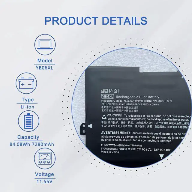 SpecificationsBattery Model :YB06XLVoltage: 11.55V; Capacity:84.04Wh 7280mAh; Cells: 6-cell; Battery Type:Lithium ion; Condition: Brand new. All our products are Certified by CE, and FCC strictly test to ensure both safety and longer life. And standards compliance for environment safety