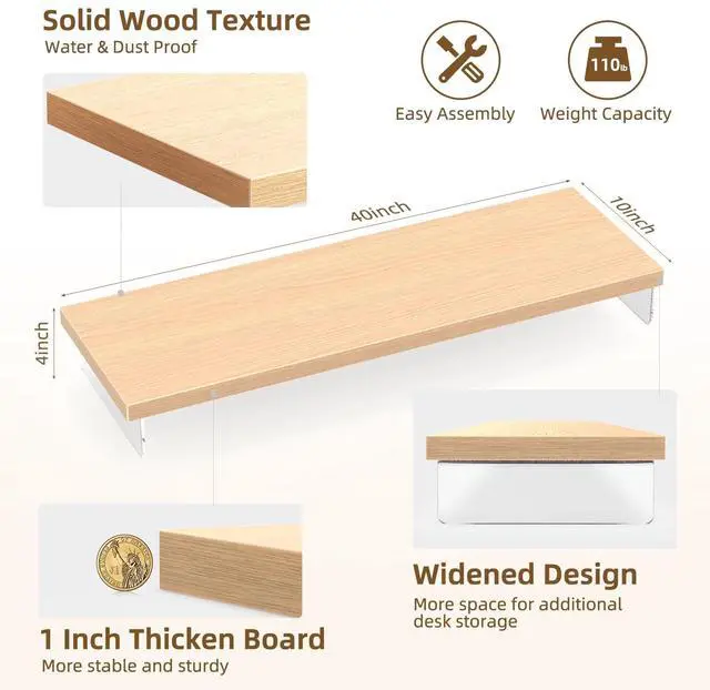 [Premium Durability] Computer monitor stand riser constructed with high-quality 1-inch solid wood and reinforced wood-acrylic hybrid structure, the stand supports up to 50kg/110lbs, making it 11% stronger than steel-embedded acrylic stands (45kg) and 42% sturdier than crystal-brick designs (35kg). Cross-jointed wood beams prevent warping, ensuring long-lasting stability.