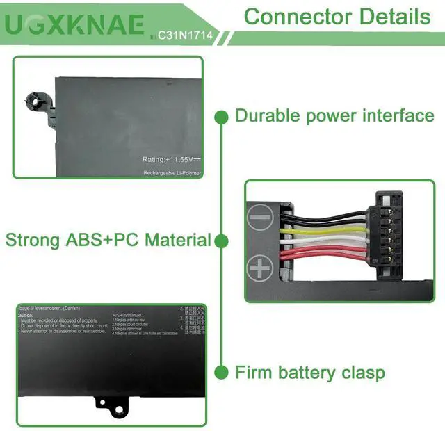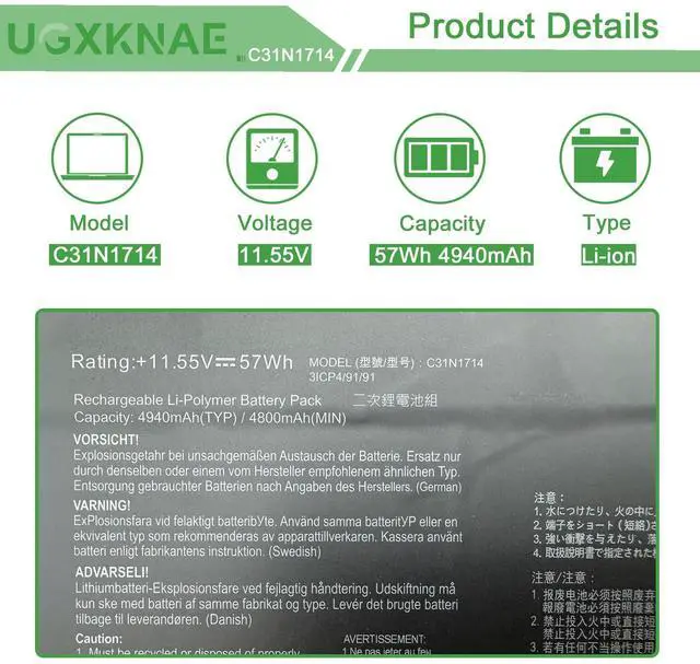 Specifications: Model Name: C31N1714 standard Rechargeable Li-ion Battery; Battery Type: Lithium_ion; Voltage: 11.55 V; Capacity: 57 Wh 4940 mAh. Color: Black. Packages includes:1x C31N1714 Laptop Battery, 2 x Screwdrivers for easy installation, 1x Instruction
