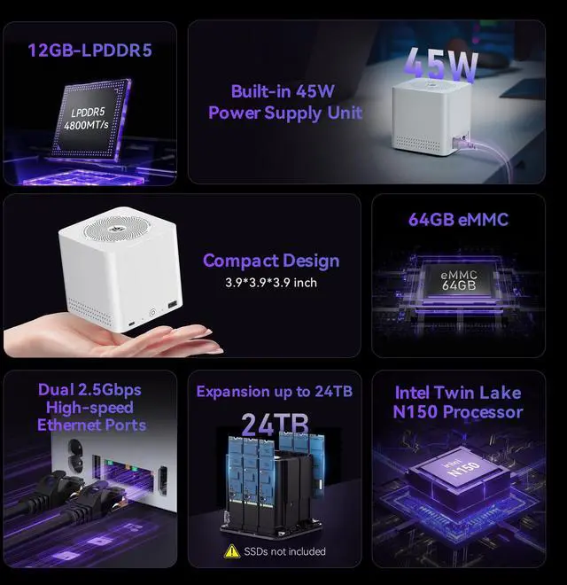 Beelink N150 Mini PC NAS - Beelink Me Mini is equipped with Intel Twin Lake N150 processor, 4 cores 4 threads, 3.6GHz max turbo frequency, Intel UHD Graphics 24EU, 25W TDP, an energy-saving mini pc which supports multiple operating systems(Windows, Linux), perfect for family media center systems, virtual machine, NAS and soft router