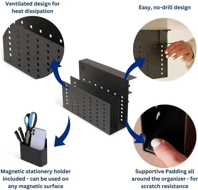 NON-SCRATCH, NON-SLIP SURFACE WITH HEAT DISSIPATION Protect your devices with a sturdy, non-slip surface designed for ultimate care. The organizer prevents scratches and keeps your devices secure. Built-in heat dissipation holes ensure your laptop and electronics stay