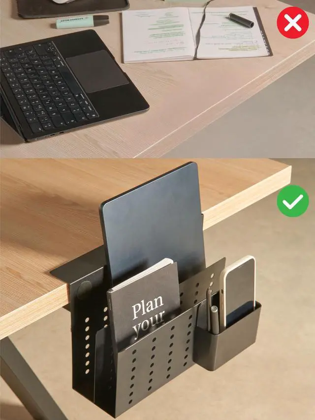 EFFORTLESS NO-DRILL ATTACHMENT Transform your workspace in minutes with the Desk Side Storage Organizer. The screwable clamp makes installation a breeze, requiring no drilling or complex tools. Attach it securely to any desk edge and enjoy instant organization. Say goodbye to clutter and hello to a streamlined setup thats as easy to install as it is to love.