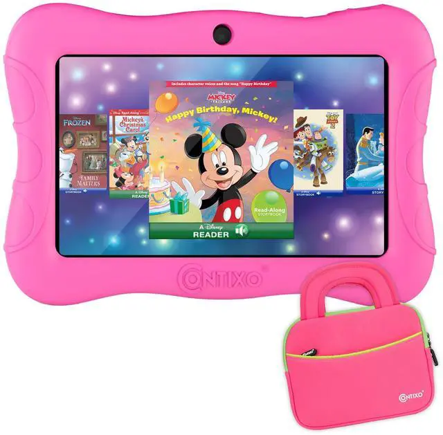 Contixo 7 Kids Tablet - V9 Android Tablet and Sleeve Bag Bundle with 50+ Disney Storybooks & Stickers (Value $200), 32GB, Dual Cameras, Parental Control, Perfect for Back to School, Pink