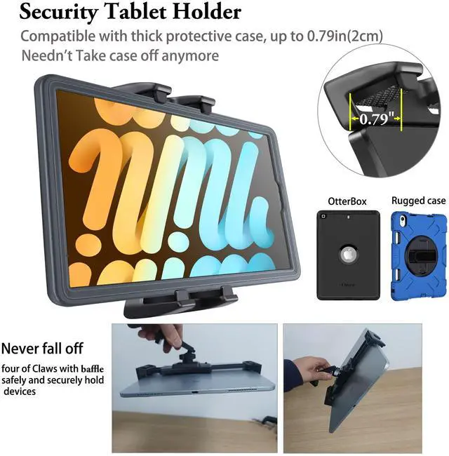 Perfect Tablet Phone Holder: Made of ABS, the solid structure, 360° Rotation & 40° Tilt Supports devices in Both mode landscape & portrail. 360° ball joint allows you to adjust the tablet in any angle and position. especially tablet holder of four claws with baffle can secrulty hold tablet and phone, Never worry about damaging your expensive iPad due to falling down. ipad holder deepth is 2 (0.8in), it suppots the most of thick case, you do not need to remove your thick tablet phone c