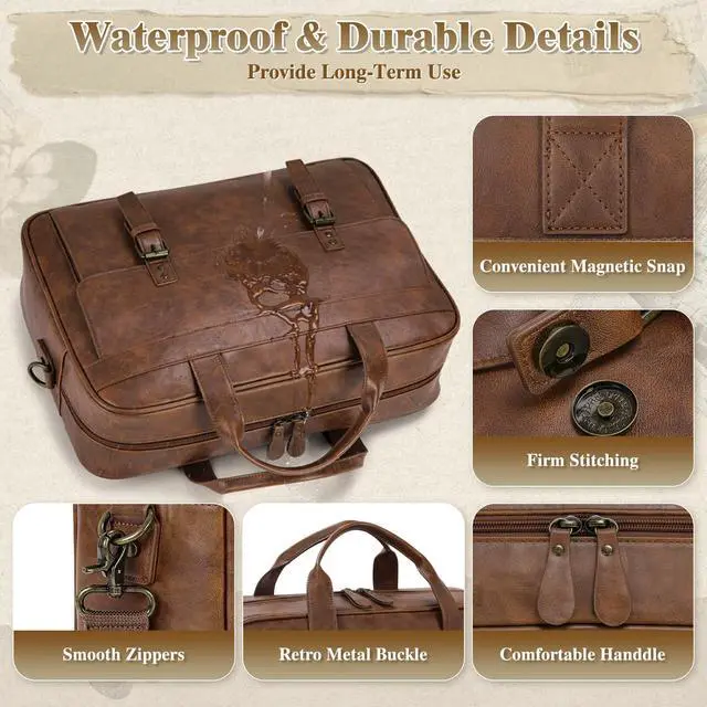 Waterproof Retro Laptop Briefcase: This retro laptop briefcase is made of high-quality PU leather, featuring fine texture and natural luster. It feels soft yet firm, making daily maintenance more worry-free. Durable brass hardware ensures lasting reliability, and thick padding protects your laptop from impact. It can hold a 16-inch laptop and is perfect for urban commuters who need a waterproof leather men's laptop bag. It can seamlessly transition to office meetings and rainy day trips