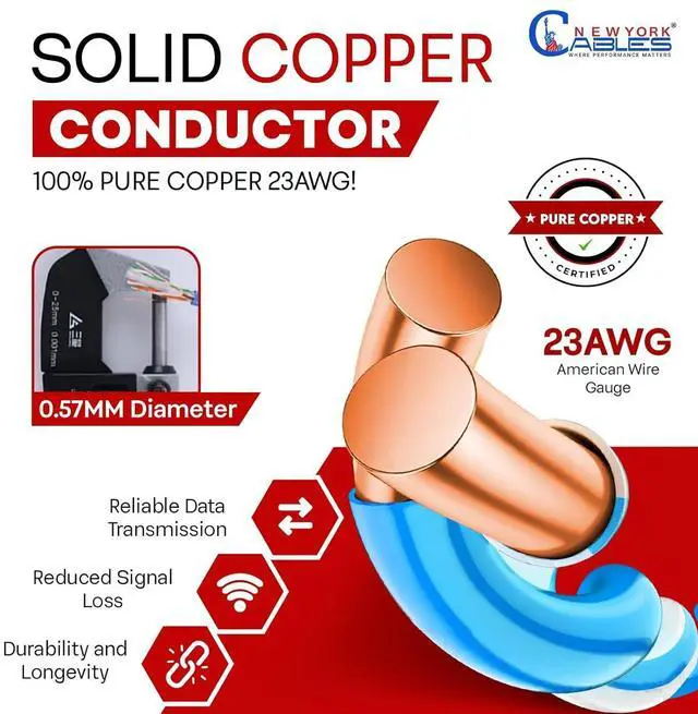 % : Pure copper conductors relay a stronger signal that can survive long lengths without distortion. Pure copper is very flexible and malleable when compared to other conductors which means that you can use pure copper conductor cables in complex installation patterns without having to worry about the cable's conductors breaking inside the cable during installation or over the years