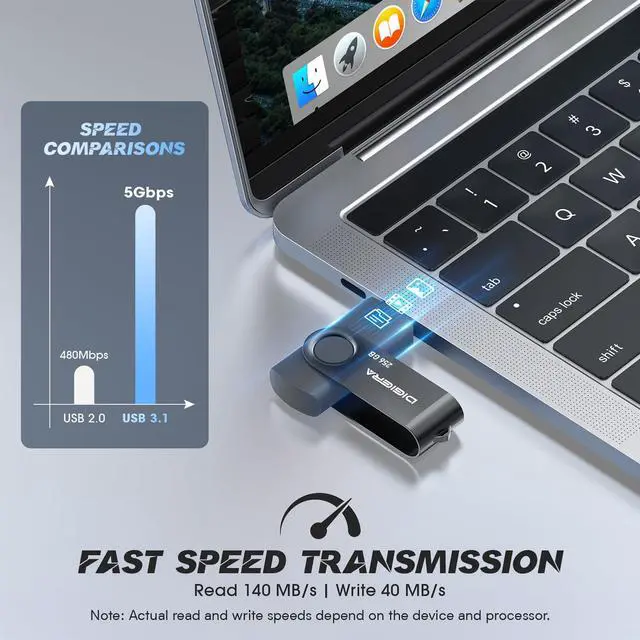 Take your data anywhere with the DIGIERA USB-C Flash Drives. Featuring blazing-fast 140MB/s read and 40MB/s write speeds, this USB 3.2 Gen 1 memory stick makes transferring large files, 4K videos, and photos effortless. Choose from 64GB, 128GB, or 256GB to meet your storage needs, whether its for school projects, work documents, or media libraries. The versatile Type-C interface ensures wide compatibility with Windows, Mac, Android smartphones, tablets, and even car audio systems. Perfect for professionals, students, and travelers, this flash drive for iPhone doubles as a system boot disk, backup drive, or portable media hub, letting you secure and access your data with ease.