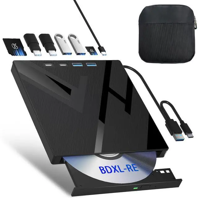 7-in-1 External Bluray Drive: This blu ray burner offers versatile features. It has 1*SD card slot, 1*TF card slot, 2*Type-C ports, 1*USB 3.0+1*USB 2.0 ports,and 1*2-in-1 cable(usb3.0+type-c) for data transfer or charging purposes. It supports re