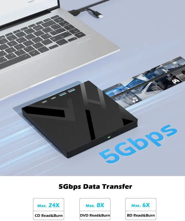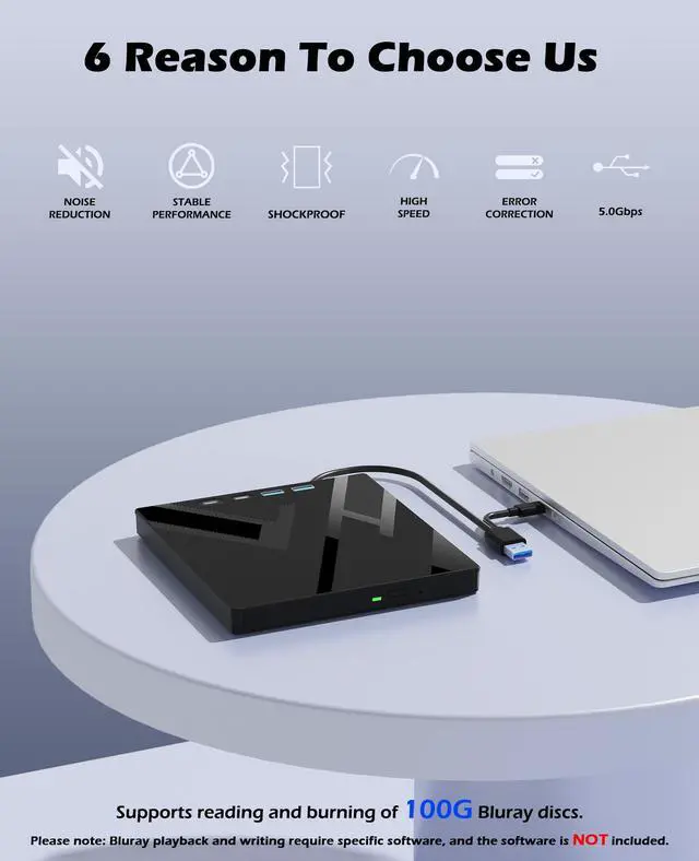 Support 100G Disc Read&Write: This external blu ray drive allows you to burn high-capacity 100GB discs, perfect for large file storage, backups, or creating high-definition content. Enjoy hassle-free burning for all your media needs. It reads Blu-ray discs at up to 6x, DVDs at up to 8x, and CDs at up to 24x.