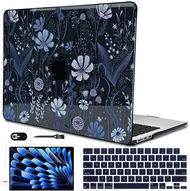 LCMOCICO Compatible with 2022 2023 2024 MacBook Air 13.6 inch Case A3113 M3 A2681 M2, Crystal Printed Pattern Plastic Hard Case Cover for MacBook 13.6 inch Air 2024 M3 Touch ID, Wild Flowers Black