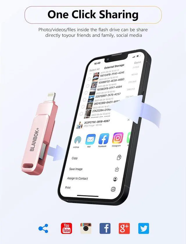 MFi certified high-quality iphone flash drive: The MFi-certified usb flash drive for iphone can ensure high quality, and also provide you with excellent performance, allowing you to store data more safely! Made of high-quality metal materials and advanced chip technology, it has excellent waterproof, dustproof, anti-drop, high temperature and anti-magnetic properties. The keychain design of the thumb drive also allows you to carry it with you to prevent loss.
