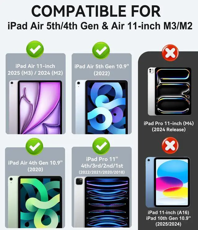 Perfect Compatible: ZoneFoker leather case designed for New iPad Air 11-inch M3 (2025)(A3266/A3267/A3270), iPad Air 11-inch M2 (2024)(A2902/A2903/A2904); 10.9 inch ipad Air 5th generation 2022 (A2588/A2588/A2589); ipad Air 4th generation 2020 (A2316/A2324/A2325/A2072); ipad Pro 11 (4th, 3rd, 2nd, 1st Gen 2022/ 2021/2020/2018) (A2377/A2459/A2301/A2460/A2228/A2068/A2230/A2231/A1980/A2013/A1934/A1979); Note: Not compatible with iPad Pro 11-inch (M4)