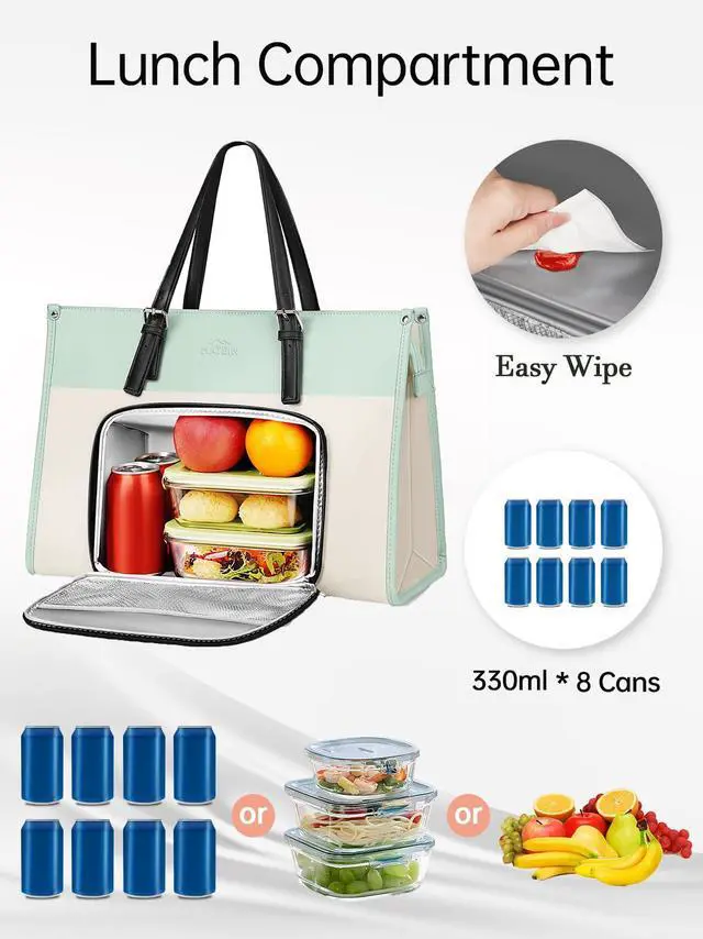 Insulated Cooler Function & Leakproof: The laptop lunch bag for women keeps food warm for 5 hours and cold drinks for 6 hours. The high quality insulated layer of lunch box compartment keeps the food fresh and warm in work, and is easy to clean. Whether its drinks or food scraps accidentally spilled, just wipe with a wet cloth. Laptop bag with lunch compartment is suitable for work, office, college, picnic, business trip