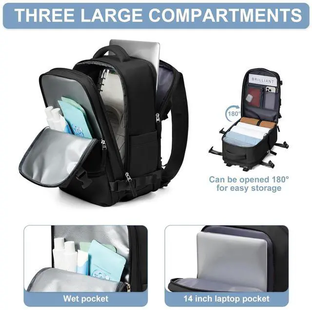 LARGE CAPACITY: This backpack travel has multiple compartments, spacious main compartment for short or business trips of 2-3 days, separate laptop compartment for a 14 laptop, the front zippered pockets of the traveling backpack keep your small items organized and easier to find. Hidden zippered pocket on the back for storing your cell phone or other valuables. Side pockets for a water bottle or umbrella.
