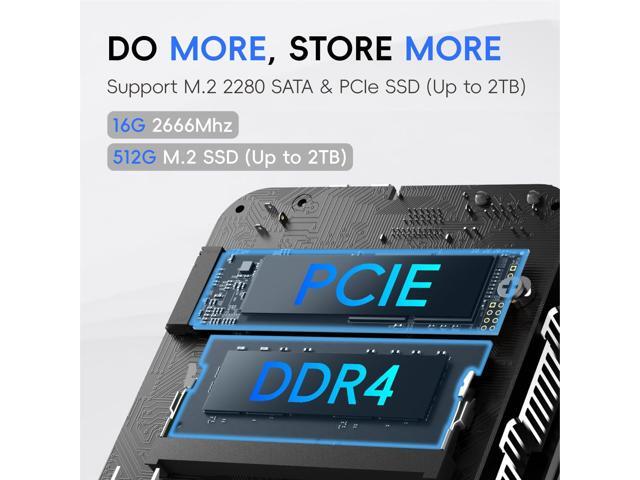 - 16GB RAM 512GB SSD UP TO 2TB MegaPC D01 mini PC with high-speed 16GB DDR4 RAM and a built-in 512GB M.2 2280 SSD. 16GB of RAM makes your entire system speedy and responsive, supporting memory-hogging tasks like multitab browsing and quickly opening large graphic files. You can also add M.2 NVMe PCIe 3.0 SSD or M.2 SATA SSD to expand the memory upgrade storage to 2TB. This setup optimizes graphics performance, providing a responsive experience for both gaming and design/data processing.