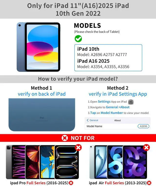 Compatibility - This keyboard case is only compatible with iPad 10.9 inch 10th Generation (models A2696, A2757, A2777) and iPad 11th 2025 A16 Chip (models A3354, A3355, A3356). Note: Please check the model number on the bottom of the back of your iPad before purchasing