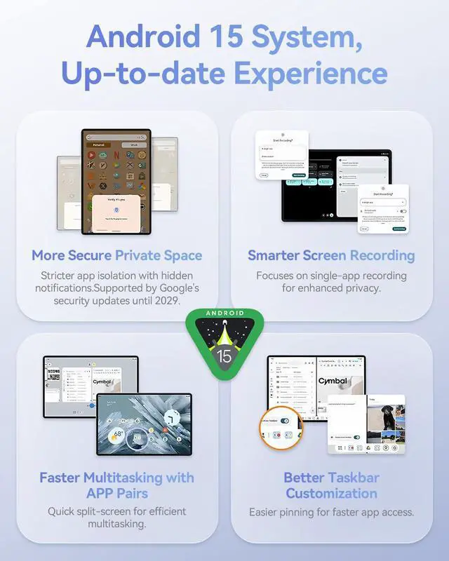 Android 15 & Face RecognitionRunning on the latest Android 15 operating system, this 11'' tablet offers a secure and intuitive user interface with enhanced privacy features including face recognition technology. Stay up-to-date with the newest Android functionalities for a smooth and personalized